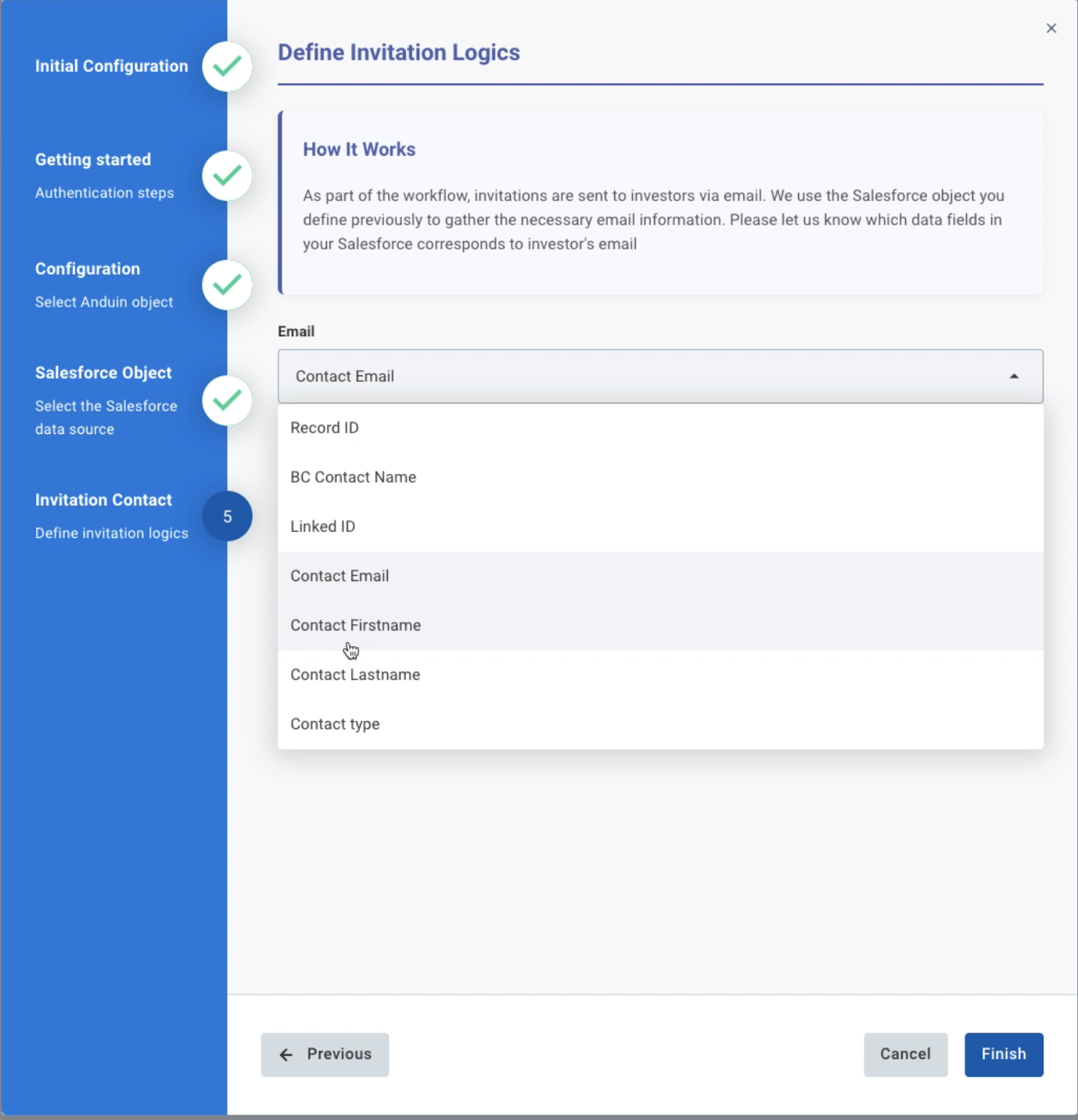 - To send out the investor invitation, Anduin must know the Email. Customer can specify which data points in their Salesforce object represent this elements
