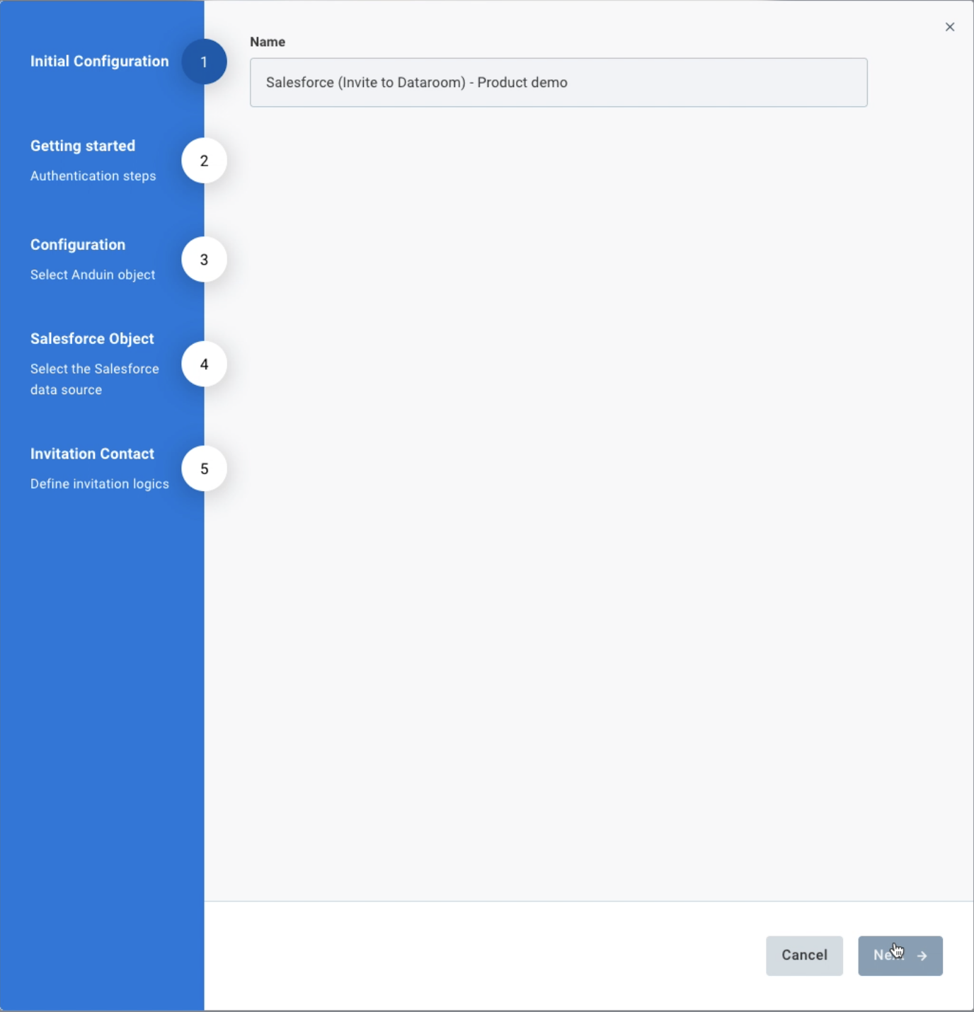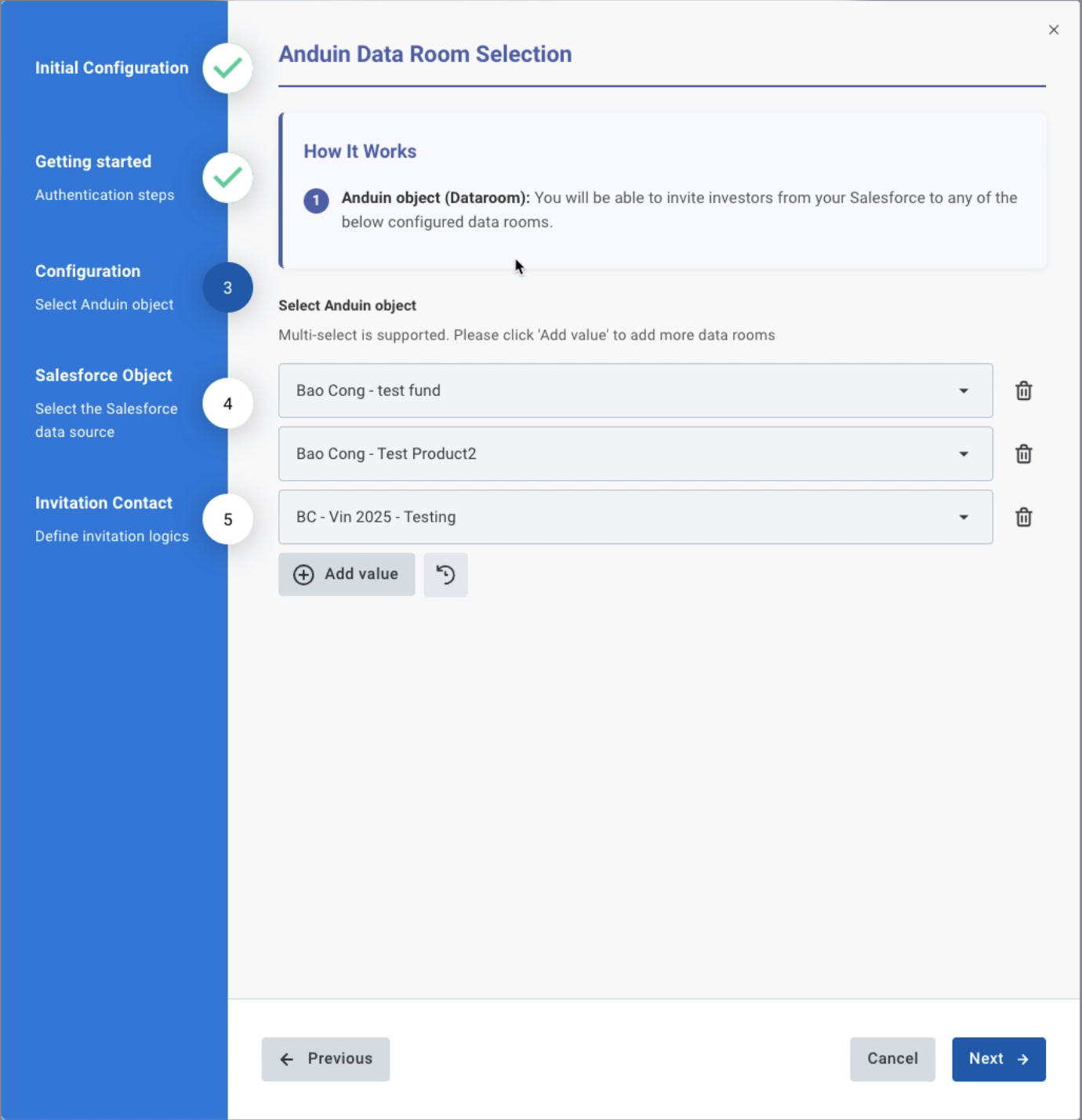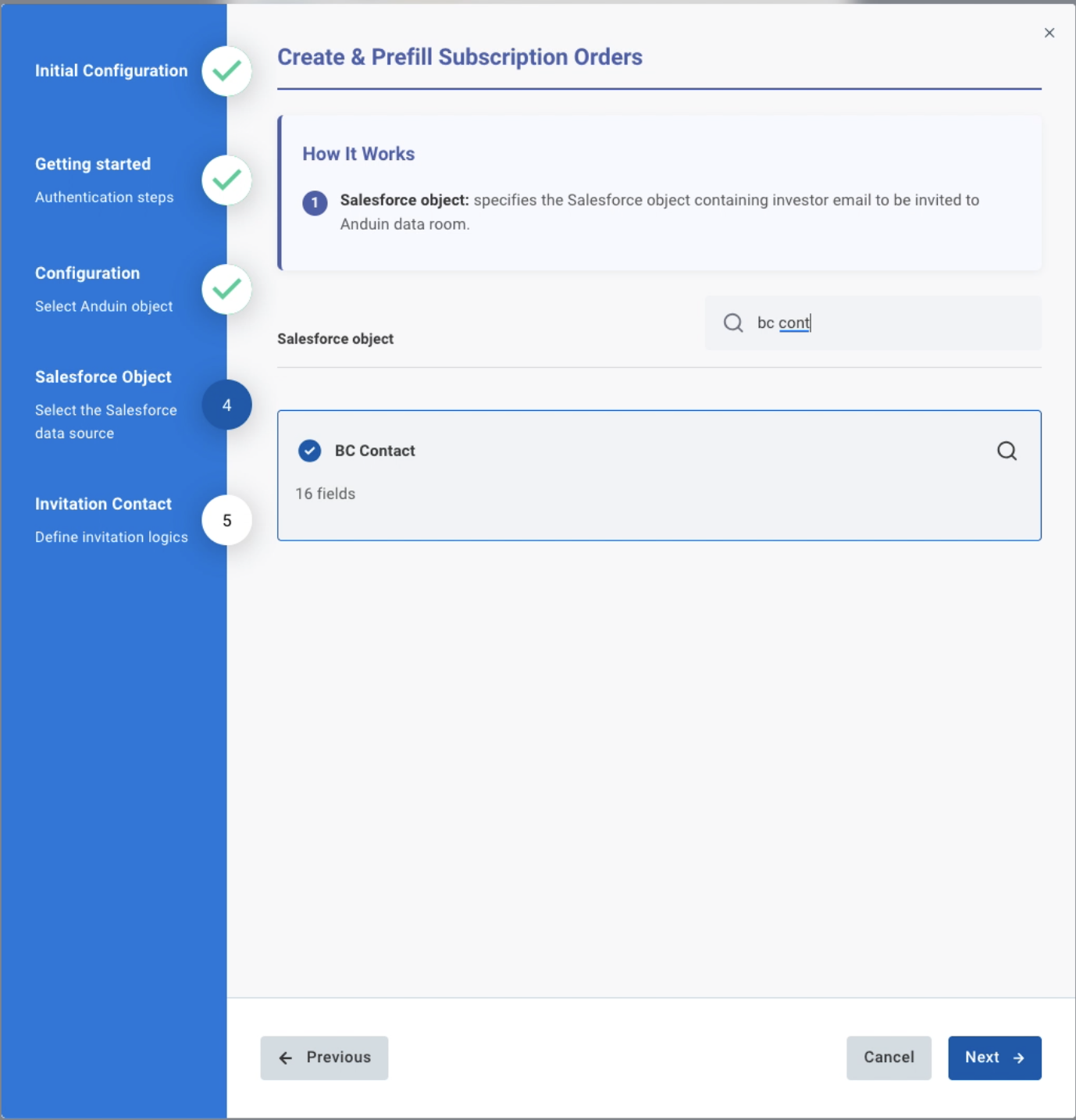- They also need to tell us the Salesforce object which contains investor’s email to be invited to Dataroom