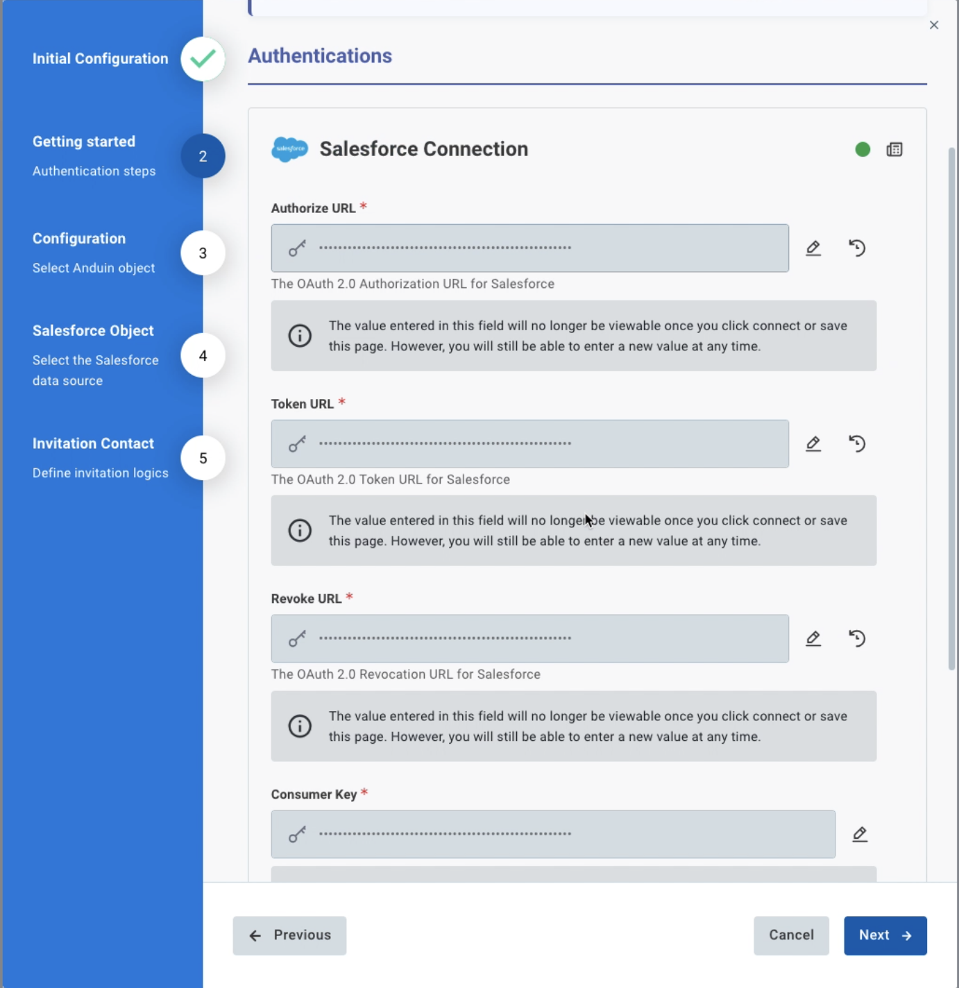 - Credentials: Customers must create a Connected App and provide the necessary credentials during setup.