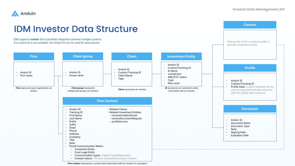 Welcome to the IDM Public API documentation webpage, where we guide you through harnessing the power of IDM Public APIs to seamlessly integrate data between your Client's CRM system and Anduin's Investor Data Management (IDM) application.