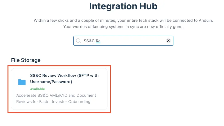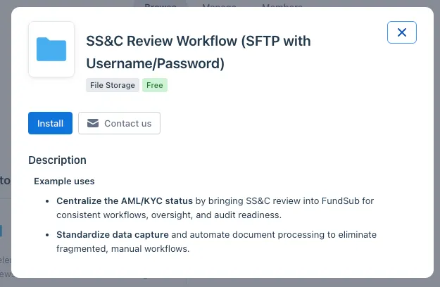 - In the Browse tab of the Integration Hub, the customer can locate the SS&C review workflow (SFTP with Private Key) or SS&C review workflow (SFTP with Username/Password) solution, depending on their authentication method.