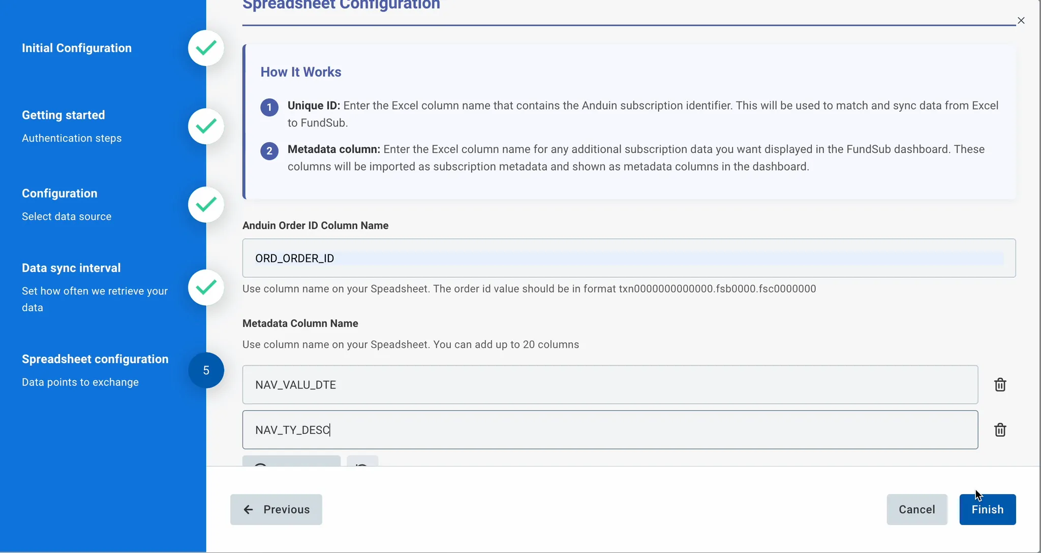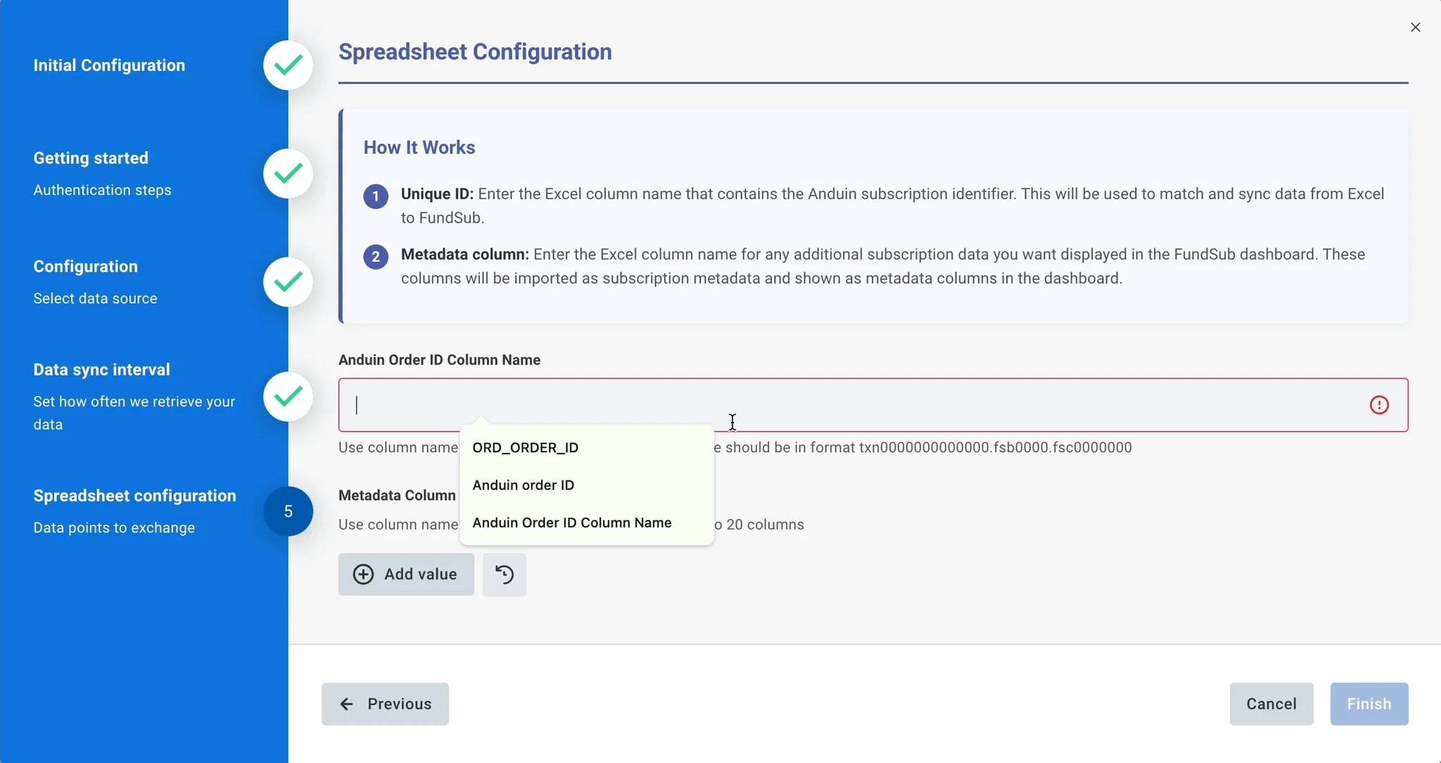 - Metadata column: Enter the Excel column name for any additional subscription data you want displayed in the FundSub dashboard. These columns will be imported as subscription metadata and shown as metadata columns in the dashboard.