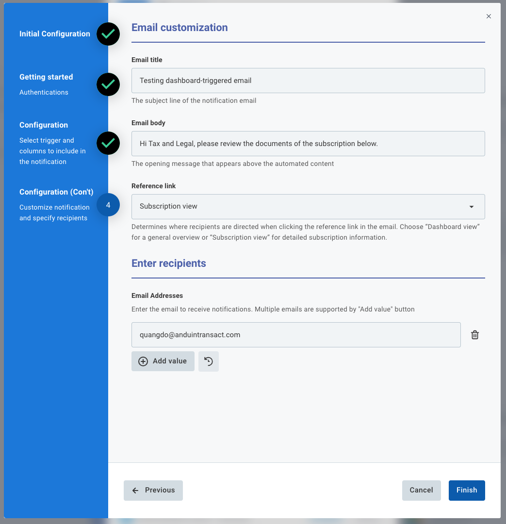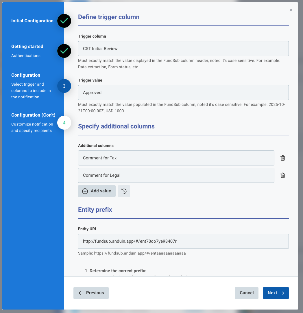- Entity prefix: Used to construct the URL included in the email, allowing recipients to navigate directly to the relevant subscription. Please follow the instructions carefully to ensure the correct value is entered.