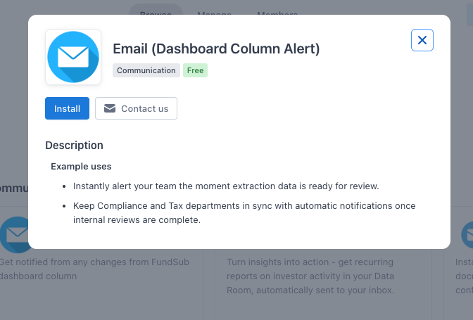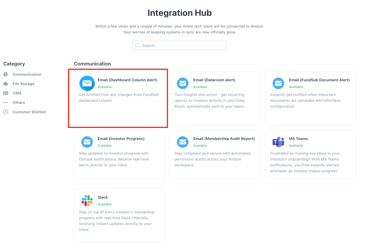 - In the Browse tab of the Integration Hub, the customer can locate the Email (Dashboard Column Alert) solution